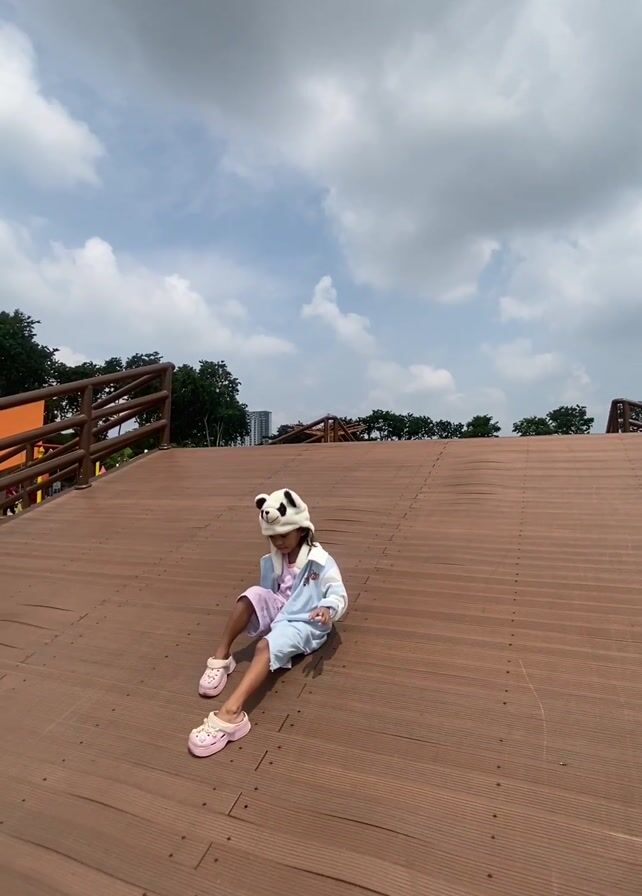 A young girl wearing a panda hat, a light blue jacket, and pink shoes is sitting on a large wooden ramp under a sky with scattered clouds. She begins sitting, then she gets onto her hands and knees and begins to crawl forward up the ramp. To her left, there is a brown metal railing and an orange wall. In the background, there are trees and a building.