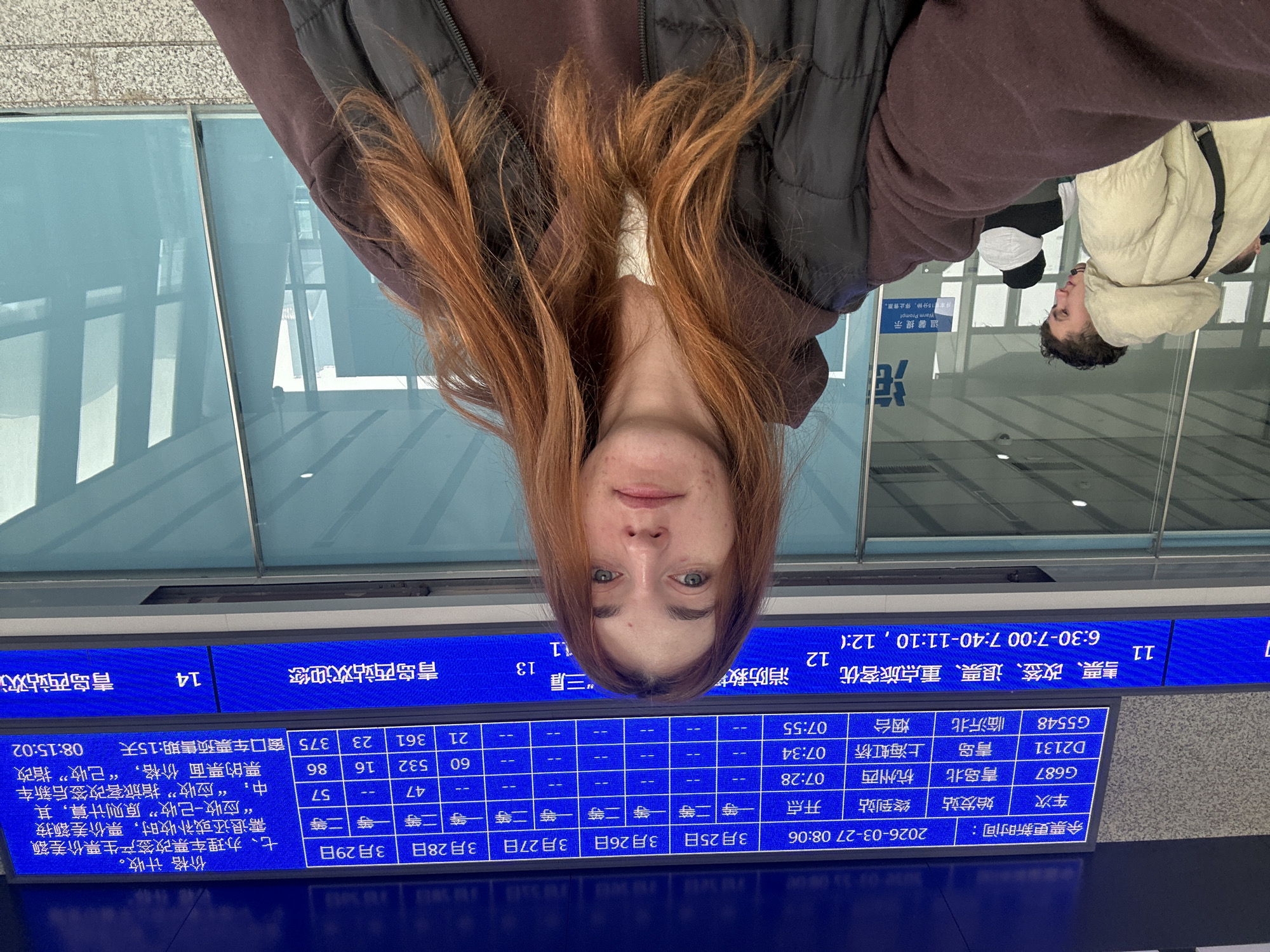 The image depicts an indoor scene at Qingdao West Station, located in Huangdao District, Qingdao, China. In the foreground, a young adult female with long, reddish-brown hair and light-colored eyes is centrally positioned, facing the camera. She wears a dark brown hooded sweatshirt over a white undergarment, topped with a black padded vest. Her expression is neutral. Behind her, to the left, a young adult male with dark hair is visible in profile, wearing a light beige padded jacket with a black strap diagonally across his torso. Another individual, partially obscured, is behind him, wearing a dark jacket and a white hooded garment. Other indistinct figures are visible further in the background through a reflective glass partition. Dominating the upper half of the background is a large blue digital display board. It shows train schedule information, including an update time of "2026-03-27 08:06". Listed trains include G687 (Qingdao North to Hangzhou West, 07:28), D2131 (Qingdao to Shanghai Hongqiao, 07:34), and G5548 (Linyi North to Yantai, 07:55), with corresponding ticket availability for March 25 through March 29. Sections of the board repeatedly display "青岛西站欢迎您" (Qingdao West Station Welcome You) and provide details on ticket sales, changes, refunds, priority services, and pre-sale periods. Below the display board, a translucent glass partition is visible, extending down to a light-colored, textured floor or wall surface.