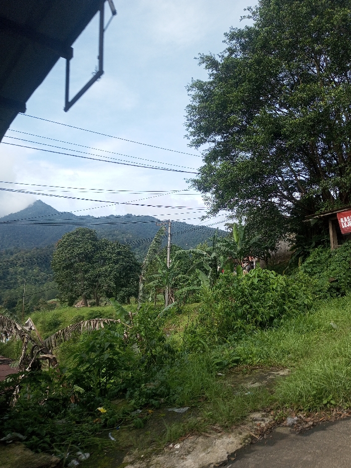 Lush greenery dominates the scene, with vibrant bushes and grasses covering the foreground. Banana trees mix with various green plants on a hillside. In the distance, a mountain peak rises against a cloudy sky. Utility lines stretch across the upper portion of the image. A large tree stands on the right, partially obscuring a small sign. A concrete surface is visible in the lower right.