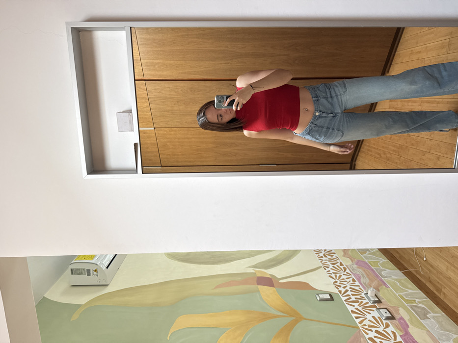 The scene is an interior space located in San Bernardino Tlaxcalancingo, Mexico. A female individual is centered in a full-length, rectangular mirror with a light-colored frame, capturing a selfie using a light-colored smartphone held in her right hand. She has shoulder-length light brown hair and is dressed in a red, sleeveless, mock-neck crop top and light blue, wide-leg jeans. A navel piercing is visible, along with a dark band on her left wrist. The mirror reflects light brown wooden wardrobe doors with linear paneling. To the left of the mirror, a white wall abuts another wall featuring a large abstract botanical mural with green and yellow tones, bordered below by a decorative pattern in earth tones. A white air conditioning unit is mounted high on the mural wall. Below the decorative border, two white electrical outlets are visible, with a white cable resting on the light-colored wooden floor. A small, light-colored rectangular object is positioned on a shelf above the mirror.