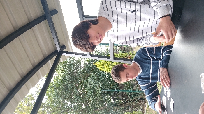 The image captures an outdoor scene featuring two young males and evidence of a third individual engaged in a card game