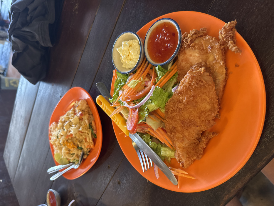 An overhead shot shows two orange plates of food on a dark wooden table. One plate contains fried rice, a lime wedge, and utensils. The other, larger plate holds two fried fish fillets, a salad with lettuce, tomato, red onion, and carrots, and two small dipping cups, one with a white sauce and the other with a red sauce. A knife and fork rest on the larger plate. A dark gray jacket is visible in the background.