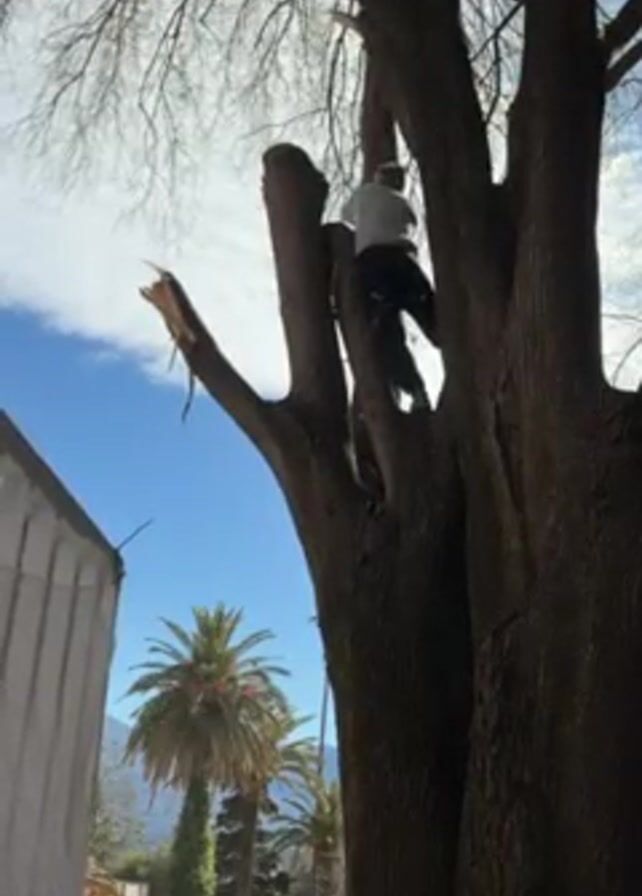 A man is cutting a large tree. He is high up in the tree, harnessed in place. The tree has several large limbs that have already been cut. The man is wearing light-colored clothing. In the background is a clear blue sky with scattered white clouds. Palm trees are also visible in the background. The sound of the chainsaw cutting is audible. To the left of the tree is a structure covered in protective sheeting, and an excavator is parked nearby.