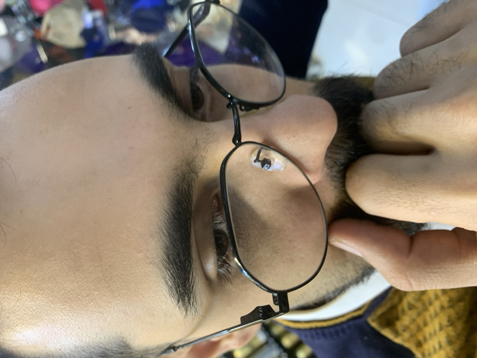 The image presents a close-up, high-angle view of a male individual, located in Barza Municipality, Syria. The subject exhibits light-toned skin, dark hair, thick eyebrows, and dark eyes directed downwards. He wears black-framed, oval-shaped spectacles. A dark mustache and beard are present. The individual's right hand is positioned with fingers curled, resting beneath his chin against his beard. He is clad in a layered outfit, including a visible white collar under a navy blue or dark upper garment, topped by a yellow patterned outer layer. The background is out of focus, revealing indistinct vertical items on shelves to the left, and a blurred display of various colored items, possibly textiles or apparel, to the right, consistent with an indoor commercial or retail setting.