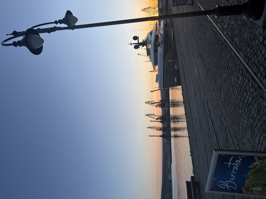 - "The image depicts a harbor scene at either sunrise or sunset, characterized by a clear sky transitioning from deep blue overhead to an orange-pink gradient at the horizon" by FM-yWeAn1, licensed under CC BY 4.0