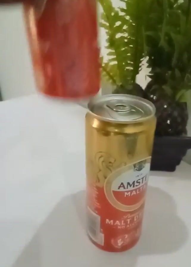 In a medium shot, two unopened cans of Amstel Malta Malt Drink are on a white table against a white wall with a potted fern. A dark-skinned hand places one can on top of the other, balancing them precariously. The first can is positioned with its bottom up, and the second can rests on its top, resulting in a wobbly stack.