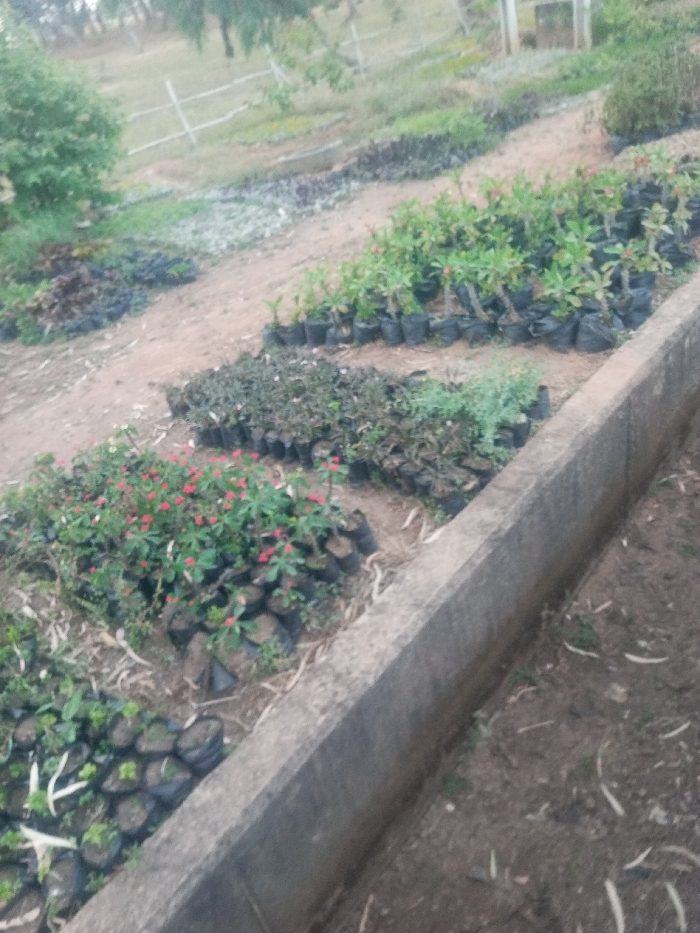 Rows of potted plants line a garden area, contained by a low concrete wall. The plants vary, some featuring red flowers, others leafy green foliage, and a few with darker, purplish leaves. All are in black plastic pots. Behind, more plants extend up a slight incline. A fence is vaguely visible in the background. The ground is dry and covered with leaves.