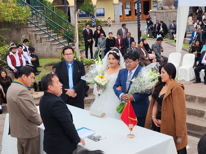A wedding ceremony takes place outdoors with a gathered crowd. The bride wears a white gown and veil, holding a bouquet. The groom wears a blue suit and glasses, also holding flowers. An official in a suit presides over the ceremony at a white table with a small flag. Other guests are dressed in formal attire, some seated on chairs in the background, and some on steps.