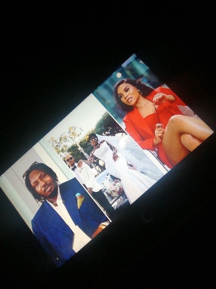 The image displays an electronic screen, tilted diagonally, presenting a collage of three distinct photographic scenes against a dark background. The leftmost panel features a man with dreadlocks and sunglasses perched on his head, wearing a dark blue blazer with a light blue pocket square and a white shirt. He looks directly at the viewer. The background consists of blurred light-colored structures and greenery. The middle panel depicts a wedding scene with a woman in a white strapless gown with a patterned, dark long-sleeved overlay and a white veil, wearing distinct cat-eye sunglasses. She stands beside a man in a white tuxedo jacket, black bow tie, and dark sunglasses. A light-colored car with a floral arrangement on its hood or trunk is partially visible behind them. The background is an outdoor setting with blurred trees and foliage. The rightmost panel shows a woman with dark wavy hair, dressed in a red blazer, red top, and a red skirt or dress, with one leg bent. She wears multiple rings on her right hand and looks slightly to her right with a subtle smile. The background is blurred, featuring teal/turquoise and white elements. The location of these displayed scenes and the photograph itself is Unknown, Unknown.