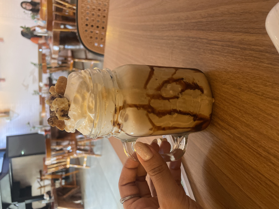 A human hand, with a silver ring on the ring finger and light-colored glitter nail polish, holds a clear glass mason jar mug containing a beverage on a light brown wooden table. The beverage is a light tan or beige color, possibly a milkshake or blended coffee drink, with dark brown syrup or chocolate sauce streaks running down the inside of the glass. The drink is topped with a generous swirl of white whipped cream, adorned with several small, irregular pieces of what appear to be cookie crumbs or baked goods. The background, out of focus, reveals an indoor commercial establishment, likely a cafe or restaurant, located in Anápolis, Brazil. Multiple blurred individuals, primarily women, are seated at wooden tables with matching wooden chairs, some featuring rattan backs. One woman is partially visible on the far right, another further back and to the left. The environment includes white walls, overhead lighting, and various blurred items on tables, possibly decorative plants or other beverages. In the far left background, dark industrial-style ventilation or kitchen equipment is visible. The lighting is soft and ambient, consistent with an indoor dining setting.