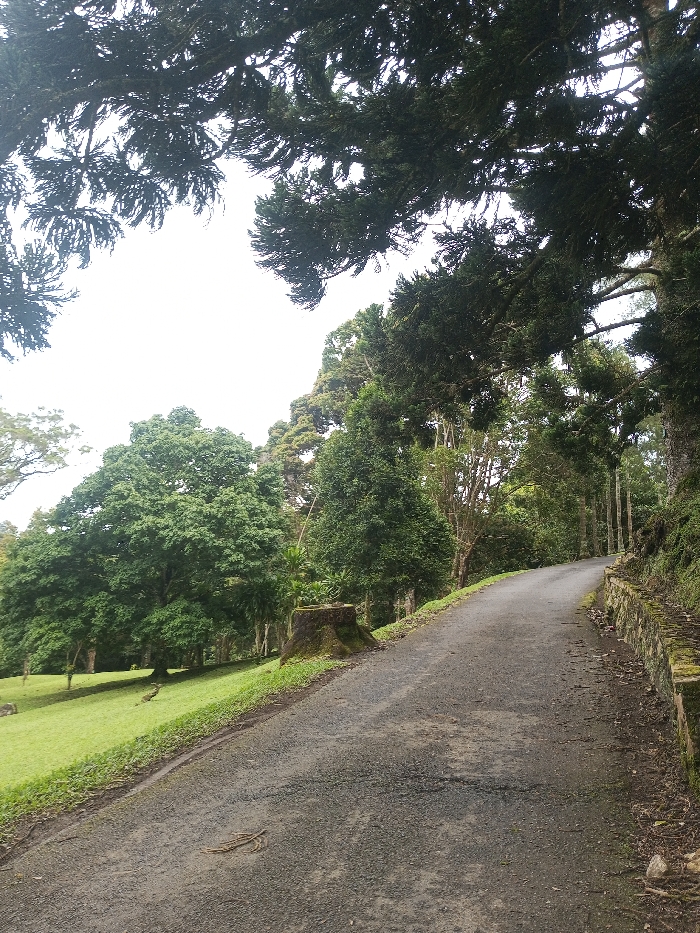 This image depicts a paved, asphalt road ascending and curving to the right through a heavily vegetated area in Padegaon, India. The road surface exhibits signs of wear and minor debris. To the left of the road, a manicured green grassy slope leads to a dense arrangement of broad-leafed trees. A prominent, moss-covered tree stump is positioned near the road's edge on the left. To the right of the road, a low stone retaining wall, partially covered in moss and dirt, supports a steep embankment densely populated with tall, slender trees and varied foliage. Overarching branches of dark green evergreen trees, possibly conifers, form a canopy across the upper portion of the frame, partially obscuring a bright, overcast sky. No individuals, animals, or vehicles are present in the scene.