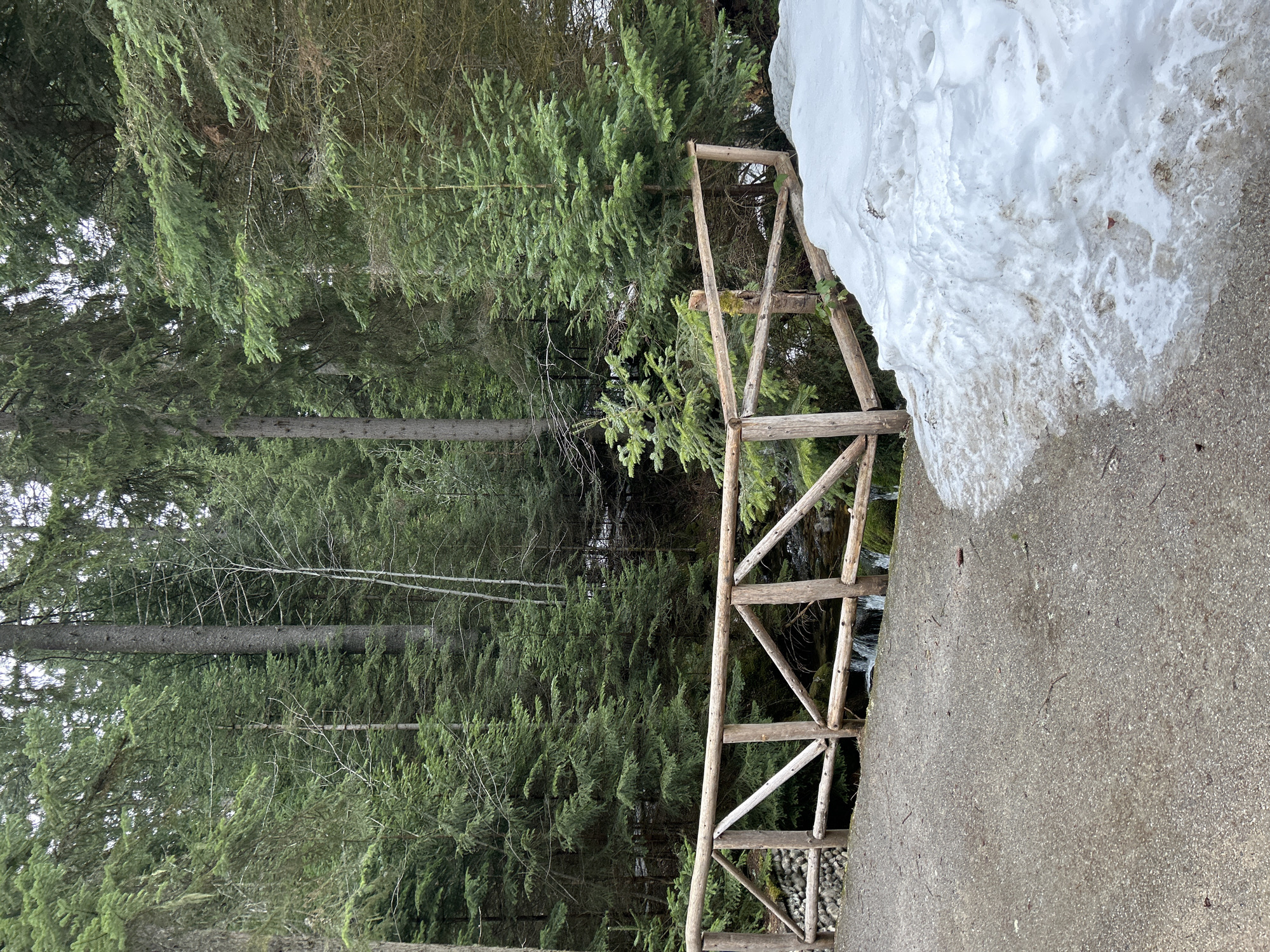 The image captures a scene at the Waterfall Eco Trail "Kaskadite" near Samokov, Bulgaria. A rough wooden fence borders a concrete path, separating it from a dense forest. A snowdrift lies adjacent to the path on the right side of the frame. The forest consists of tall, evergreen trees. A waterfall trickles down into a creek hidden beneath the forest floor.