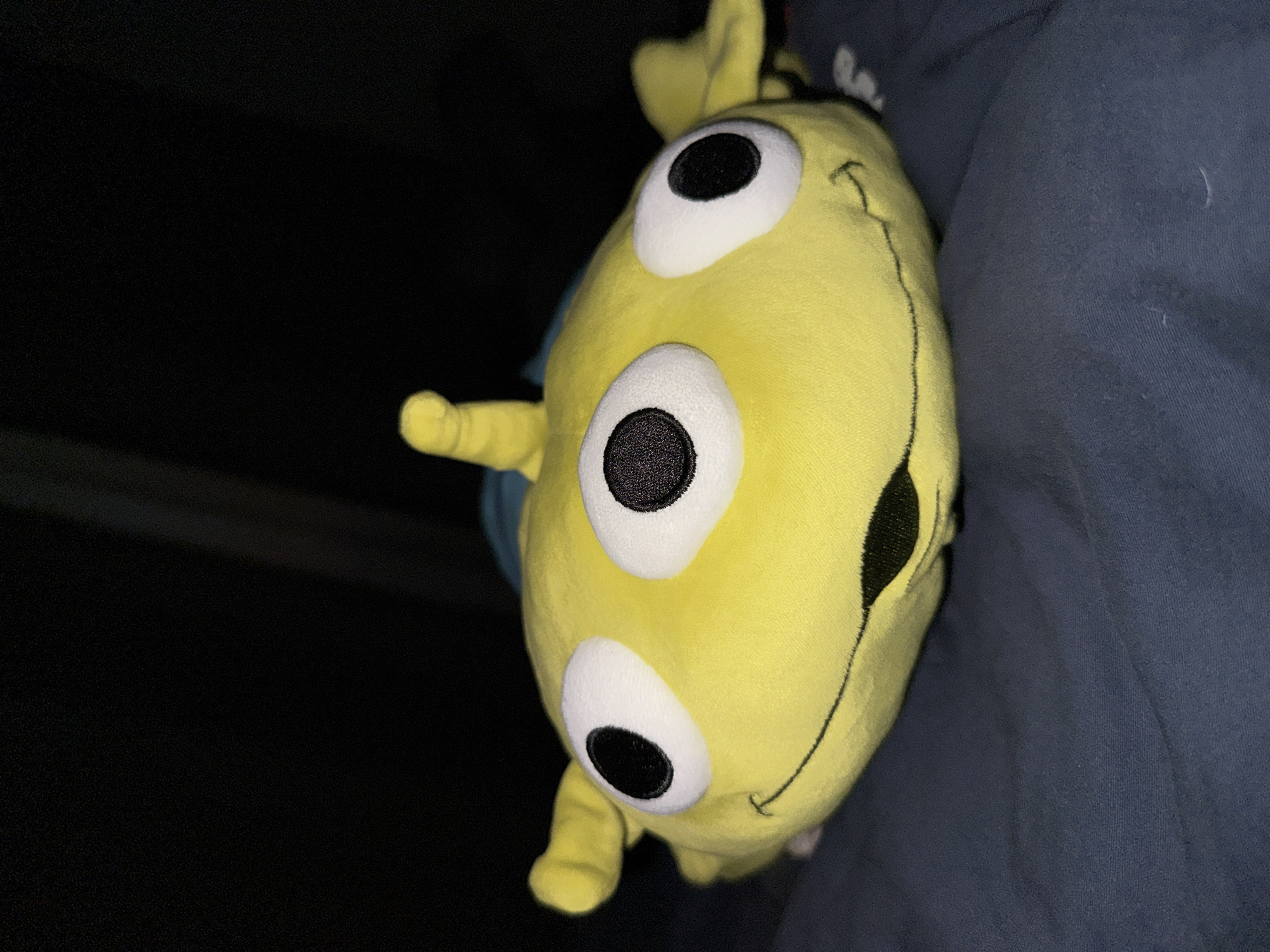 A yellow plush toy is positioned centrally on a dark blue textile surface, likely bedding, within an indoor environment characterized by low illumination. The toy is identifiable as an "Alien" character from the Toy Story franchise, presenting three prominent white eyes with black pupils, a small black stitched smile, a singular yellow antenna extending from its head, and small yellow ear-like structures on its sides. The background is predominantly black, with faint vertical dark elements visible on the far right, indicating a dark wall or curtain. No individuals are present, and no actions or interactions are depicted beyond the static placement of the toy. The scene is located in Sofia, Bulgaria.