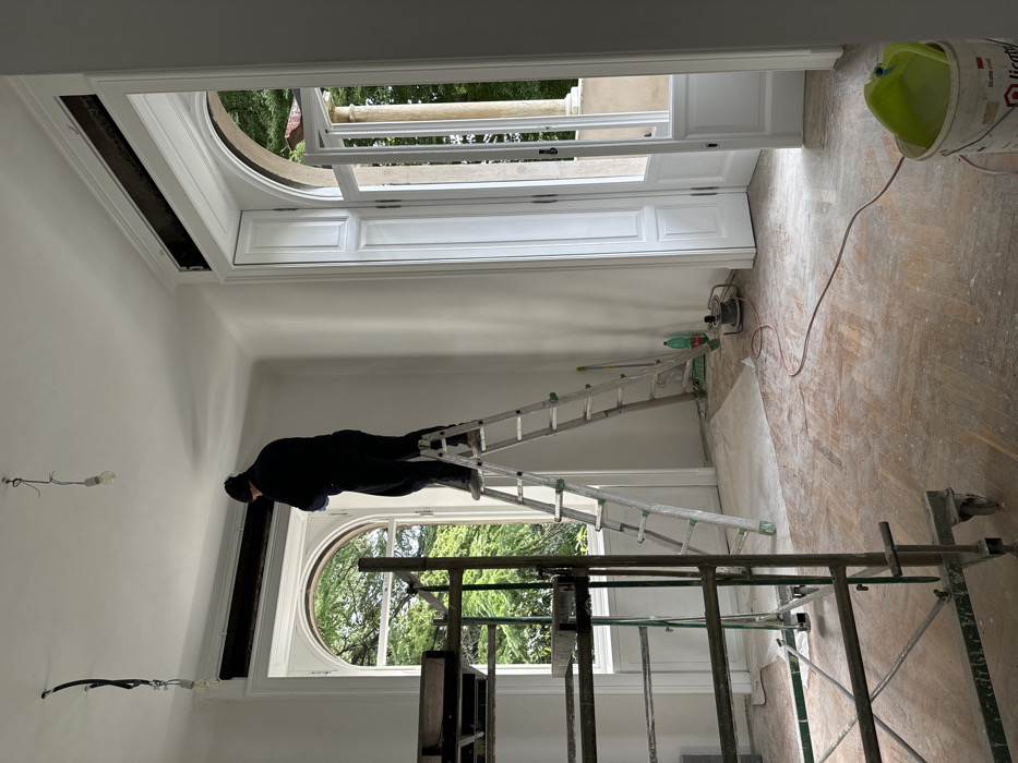 The image depicts an interior room under renovation in Lezza, Italy. A single individual, dressed in dark work attire, stands on the top steps of a silver A-frame stepladder positioned centrally, facing and engaged in work at the upper section of a large, arched white-framed window on the left. To the left foreground, a metal scaffolding unit is partially visible. The room features freshly painted white walls and a white ceiling with exposed electrical wiring and two bare incandescent lightbulbs. The floor consists of distressed wood flooring, partially covered by white protective sheets. A red electrical cord runs across the floor from a power tool situated near the right wall. Also near the right wall are a green broom and a red plastic bottle. An open, arched white-framed door on the right reveals an exterior space with a classical column and a paved area. The window on the left overlooks dense green foliage. A white bucket containing a green plastic container, labeled "LICATE.C," is located in the lower right corner. The upper frames of both the window and door display dark, recessed cavities.