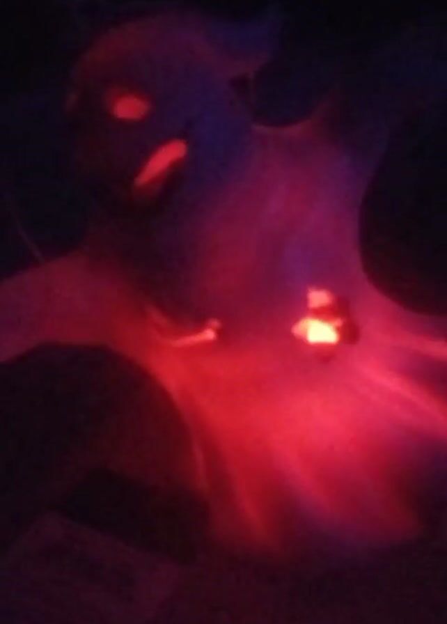 Halloween decoration in the shape of a ghost. The ghost is illuminated by a shifting light that changes from red to green. The decoration has eye and mouth cutouts that are lit by the internal light. The background is dark.