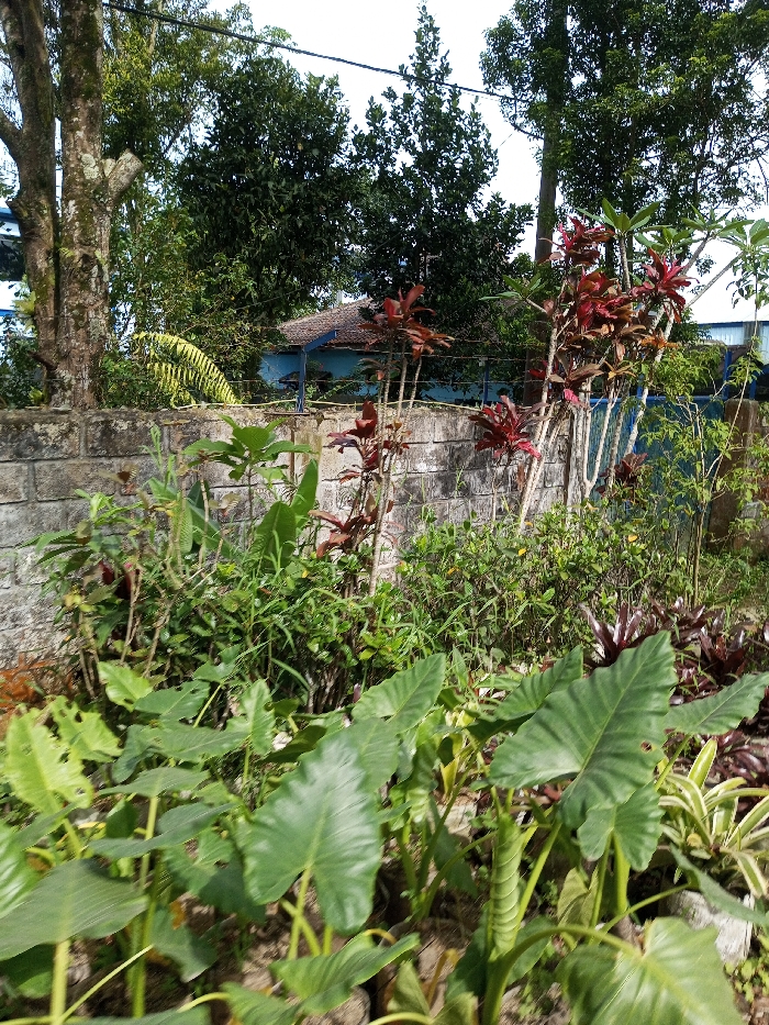 The image displays an outdoor vegetated scene in Kandenuwara, Sri Lanka, illuminated by bright daylight. The foreground is dominated by multiple large-leafed green plants, likely an aroid species, exhibiting prominent venation and some minor leaf damage. Directly behind these plants, a concrete block wall, discolored with patches of biological growth, extends horizontally across the mid-ground. Over and behind the wall, dense foliage is visible, including several Cordyline fruticosa plants with slender stems and distinct dark red to maroon leaves. Other green shrubs and smaller plants are interspersed. In the background, partially obscured by the wall and vegetation, a structure with a light blue facade and a dark tiled roof is visible. Tall, dense green trees frame the upper portion of the scene against a bright, clear sky. Thin, dark wires traverse the upper mid-ground. No individuals or discernible actions are present.