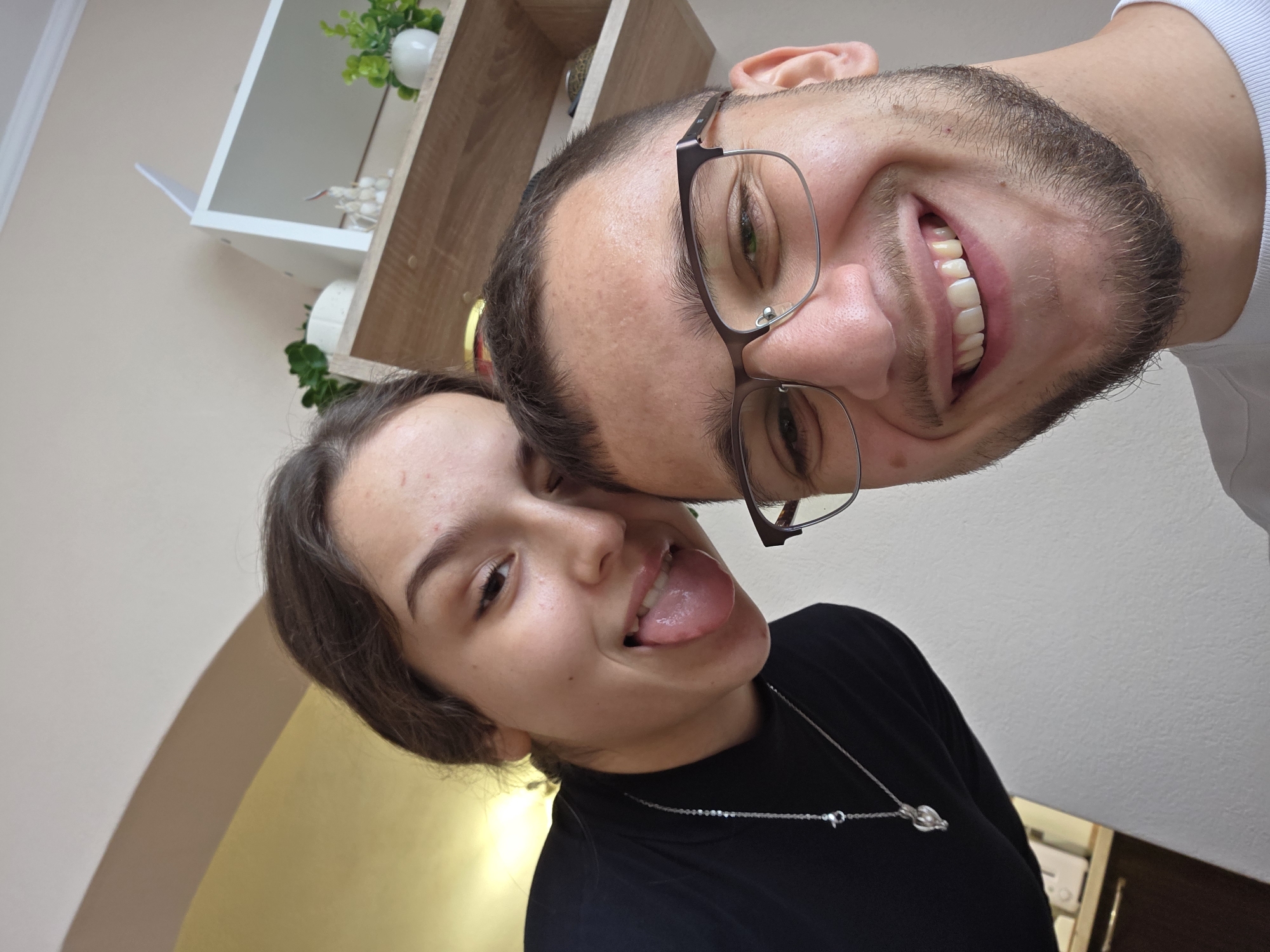 The image is a selfie taken from a high angle, depicting two individuals. The person on the right is male, with short brown hair, a beard, and glasses. He is smiling broadly, exposing his teeth. The person on the left is female, with dark hair, and is sticking her tongue out. She is wearing a black shirt and a silver necklace. In the background, there is a partially visible wall, a wooden shelf unit with a white shelf above, and some decorative plants. The image appears to be taken indoors, presumably in a home, but the location is not specified. The location in the city of Enina, Bulgaria, cannot be determined from the image.