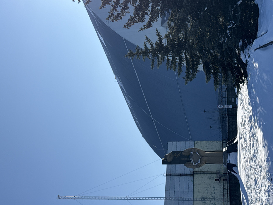 The image depicts a winter scene at the Chernobyl Nuclear Power Plant site, adjacent to Pryp'yat', Ukraine. In the midground, the "Prometheus" monument, a dark, stylized statue of a figure holding a flame, stands on a snow-covered plinth. To the left of the monument, a tall, slender metal lattice radio mast with guy wires extends upwards against a clear blue sky. Partially visible behind the monument is a light-colored building with horizontal paneling and a dark ladder structure. The dominant feature on the right and in the background is the New Safe Confinement (NSC), a massive, arch-shaped dark blue structure covering Chernobyl Reactor 4, with some snow streaks visible on its surface. Several dark green evergreen trees are positioned on the right, partially obscuring the NSC. The ground in the foreground is entirely covered in a layer of white snow, exhibiting distinct shadows. A small circular road sign is visible on the right, near ground level, in front of a dark, low-lying structure. No people are present.