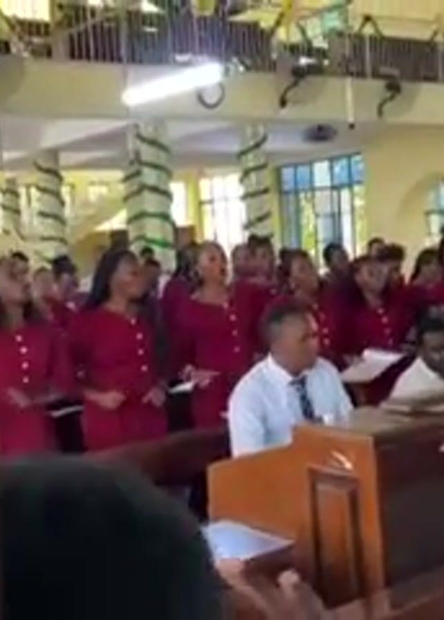 A choir sings in a church with stained glass windows and ceiling fans. The choir members wear red outfits and stand near a piano. A person plays the piano while the choir sings, their voices clearly audible. The church has green and white decorations, possibly for a holiday or special event. People in the congregation film the choir with their phones.