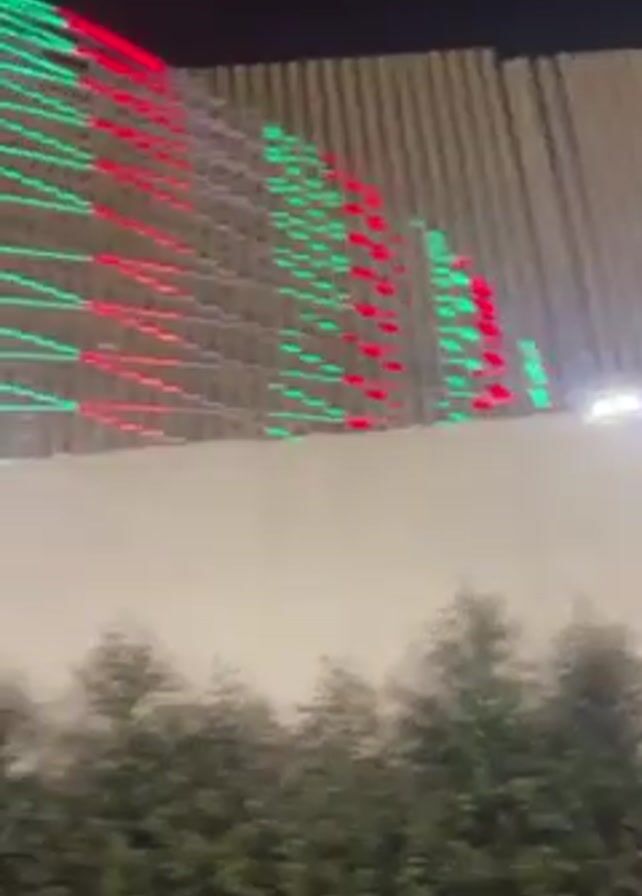 At night, a tall building is lit with green, red, and blue lights. The lights are arranged in straight lines, creating an intricate pattern across the facade. A short hedge sits in front of a white wall, obscuring the bottom of the building. A group of people is walking in front of the wall. The video is shaky as the camera moves around.