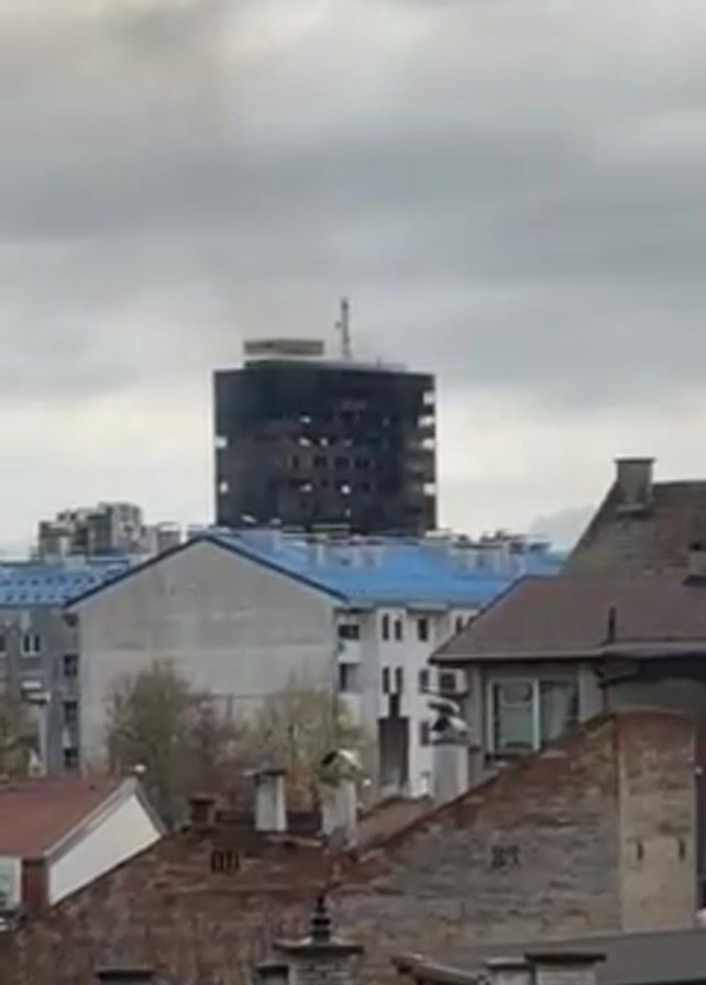 n outdoor shot of a city skyline on a cloudy day. The view is partially obstructed by rooftops with red clay tiles and bare tree branches. In the distance, there's a tall, dark building with visible fire damage and some smoke emanating from its upper levels. The building appears to be a high-rise with numerous windows, some of which are blackened by soot. Surrounding the damaged building are other residential and commercial structures, some with blue roofs. The sky is overcast, creating a somber and muted atmosphere.