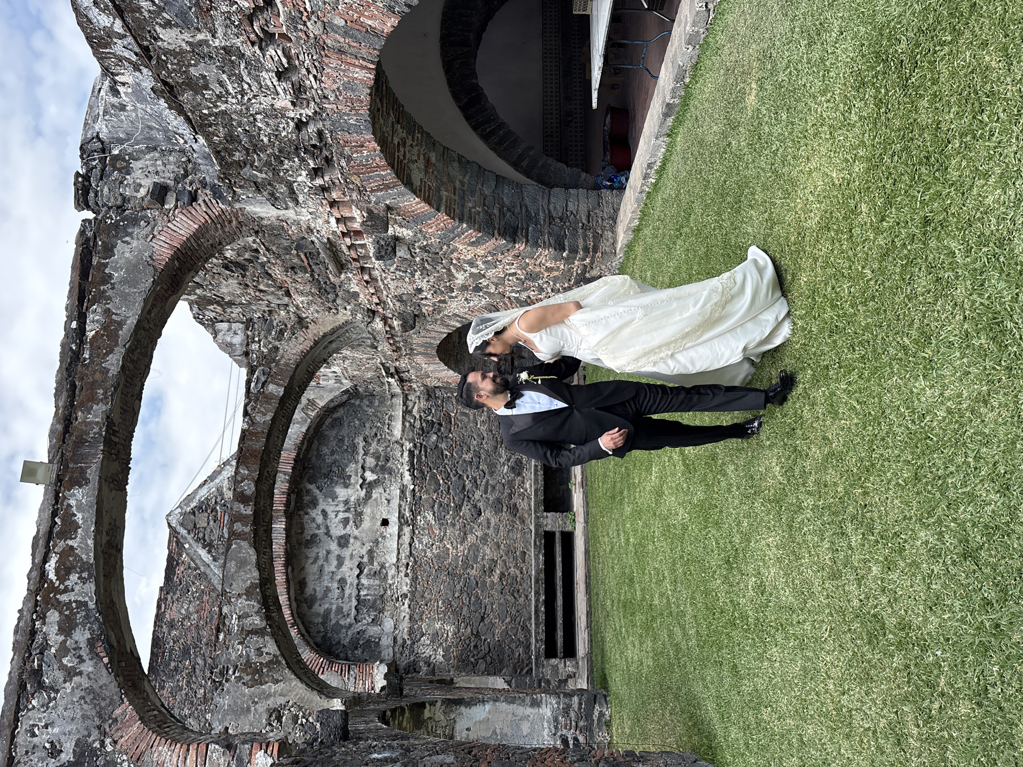 A newly married couple, a woman in a white wedding dress and veil and a man in a black tuxedo, stand on a green lawn in front of the crumbling stone and brick ruins of the Progreso, Mexico International Pier customs office. They are in a close embrace and appear to be kissing. The architectural remains include arched openings and walls. The sky is visible through the openings.