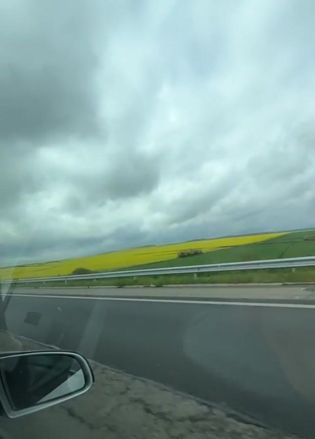 The view from inside a moving vehicle shows a bright yellow field across a guardrail, with a heavily clouded sky