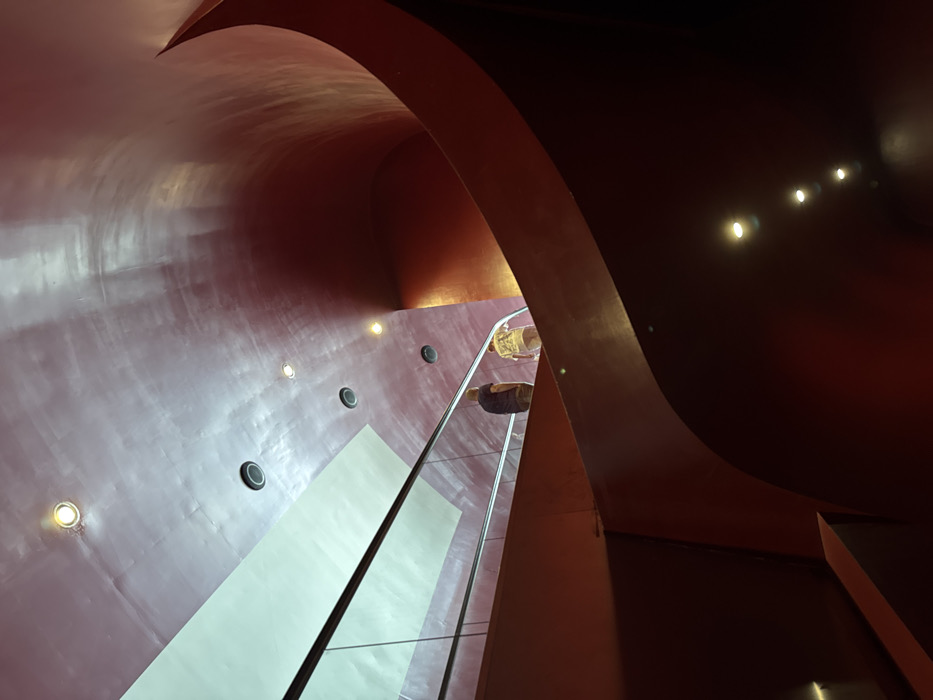 This image depicts an interior architectural space, identified as the Fiera Milano exhibition center in Rho, Italy, characterized by a dominant red and burgundy color scheme. Two individuals are observed ascending an escalator positioned centrally. The scene features expansive, curvilinear walls and ceilings, painted in a matte to semi-gloss deep red or burgundy hue. A flat, light-colored panel, possibly cream or pale green, is integrated into the ceiling directly above the escalator, contrasting with the red surfaces. Multiple recessed circular light fixtures, emitting warm yellow light, are visible on the red ceiling and along a lower, curved wall section on the right. Darker circular fixtures, possibly vents or speakers, are also present on the ceiling. The escalator, equipped with transparent glass side panels and metal handrails, carries the two individuals away from the viewer. The person in the foreground wears a dark shirt, while the second individual, positioned behind and slightly further up the escalator, wears a lighter-colored shirt. Their faces are not discernible. A prominent, dark red, sweeping curved wall or railing forms a significant part of the foreground and lower right of the image, emphasizing the architectural flow. The lighting creates varying degrees of illumination, highlighting the textured and reflective qualities of the red surfaces.