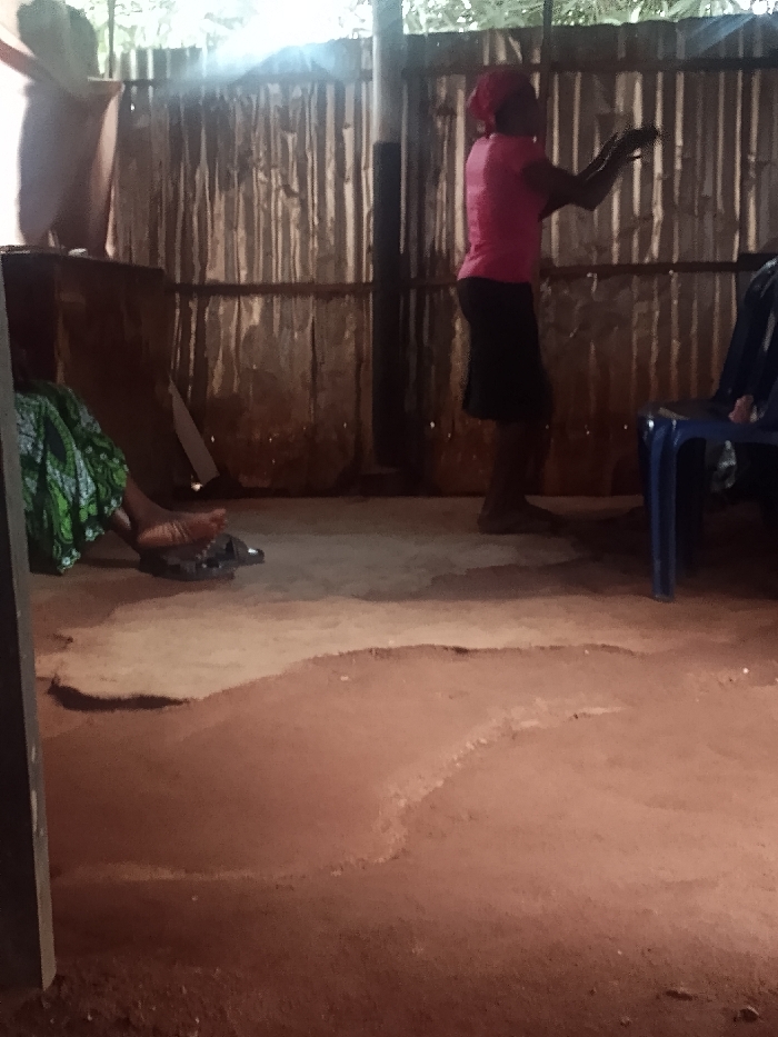 The image depicts an interior scene within a rudimentary structure in Unknown, Unknown. The walls are constructed from vertically oriented corrugated metal sheets, exhibiting varied textures and discolorations, supported by dark vertical posts. The floor is composed of uneven, reddish-brown bare earth. Natural light, strong and bright, enters from above the wall line on the left, casting illumination onto the corrugated panels. In the mid-ground, a person stands facing left, wearing a pink short-sleeved top, a dark skirt, and a red head covering. This individual is barefoot and holds their arms raised with hands open and palms slightly upward, in a gesture suggesting speech or active engagement. To the far left, partially visible, a second person is seated; their lower body is covered by green patterned fabric, and their bare right foot rests on a dark-colored sandal or slipper placed on the ground. A blue plastic chair is positioned on the far right. No direct interaction is observable between the individuals.