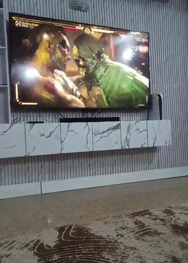 TV screen displaying a Mortal Kombat match. The characters are fighting in a jungle-like environment. The text "FINISH HIM" is displayed in large red letters. The TV is mounted on a white marble-patterned stand against a gray striped wall. A PlayStation 5 console is visible to the right of the TV. The floor is covered with a glossy tile and a decorative rug. The camera is positioned low and close to the ground, providing a view of the room.