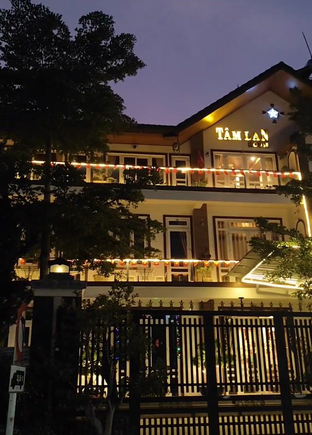A dimly lit, stationary shot captures a two-story building with the name "TAM LAN" displayed in illuminated lettering on its front facade. The building is adorned with strings of lights along the balcony and roofline, and a black metal fence borders the property at ground level. Trees partially frame the building on either side. The sky above is dark with hints of purple, suggesting dusk or night. A road sign is visible on the left-hand side of the shot.