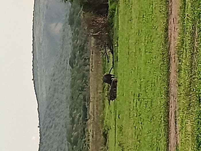A landscape view features a lush green field occupying most of the frame, bordered by a narrow dirt path on the right. Dark objects, possibly animals, are nestled within the field. A dense forest lines the edge of the field, transitioning into a misty mountain range in the background. The sky is overcast, creating a soft, muted light across the scene.
