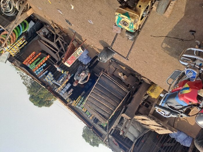 The image depicts a sunlit roadside commercial area in the city of Itobe, Nigeria. The scene is significantly tilted counter-clockwise. Two open-front stalls, constructed with corrugated metal walls and roofs, are situated on the left side of an unpaved path. The stall on the left displays bundles of white material outside and hanging packaged goods within its entrance. An adult male, wearing a light-colored t-shirt and dark trousers, stands near the entrance of this stall. The adjacent stall to the right features numerous colorful packaged goods hanging across its frontage. Inside, stacks of multicolored vehicle tires and several silver-colored wheel rims are visible. A brown A-frame sign stands in front of this stall. A second, partially obscured individual is visible deeper within this stall. In the immediate foreground, the handlebars and front section of a red and blue motorcycle are visible, oriented away from the viewer. The unpaved ground in the mid-ground and foreground contains various objects: a green and yellow engine unit, a smaller engine or pump, a black garbage bag, and several metal reinforcing bars. A yellow jerrycan is also present on the ground near the left stall. The background consists of sparse trees under a clear sky, indicating direct sunlight.