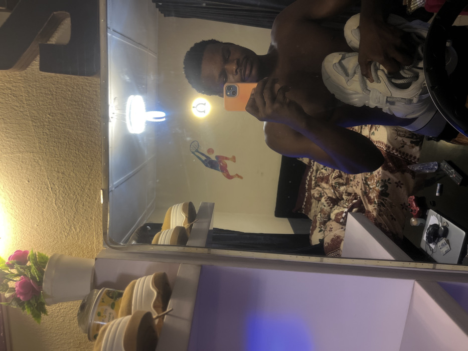 A shirtless man poses for a mirror selfie, holding a white sneaker. The reflection captures a bedroom scene: a bed with patterned bedding, a black headboard, and a glossy black table holding electronics. A basketball player decal adorns the wall. Artificial flowers and decorative items sit on a shelf below the mirror, illuminated by a soft purple light. The mirror's surface shows reflections of light fixtures. The man holds a phone, his gaze directed toward it.