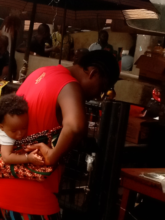 The image depicts a scene within a market or commercial area in Umudioka, Nigeria. In the foreground, a woman with dark skin and dark braided hair is visible from the back, wearing a red sleeveless top featuring a light-colored, stylized emblem on the upper back. Multicolored striped fabric, likely part of her lower garment, is visible below the red top. An infant with curly dark hair, dressed in a white t-shirt, is secured to the woman's back using a brightly patterned fabric wrap. The infant's hands are clasped together. The woman is bent forward, looking downwards, engaged in an unseen activity. To the right of the woman, a black metallic grid structure is present. Further to the right, a dark wooden table holds various objects, including a clear plastic bag and a white material. Overhead, portions of striped dark umbrellas or canopies are visible, providing shade. The background contains several blurred figures of adults, suggesting a public and active environment. Brown cardboard boxes and other indistinct market-related objects are scattered throughout the scene. The lighting is dim, indicating an enclosed or heavily shaded outdoor setting.