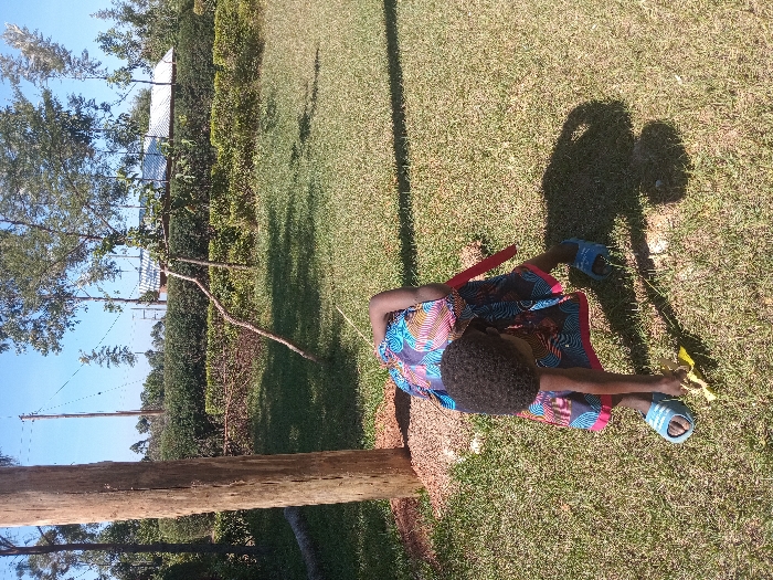 A person with short, dark hair is sitting in a red chair on green grass, wearing a colorful patterned dress and blue sandals. Their shadow is cast on the grass. In the background, there's a tree, a hedge, a building with a white roof, and a clear blue sky. A wooden pole is visible in the foreground. The camera angle is slightly overhead.