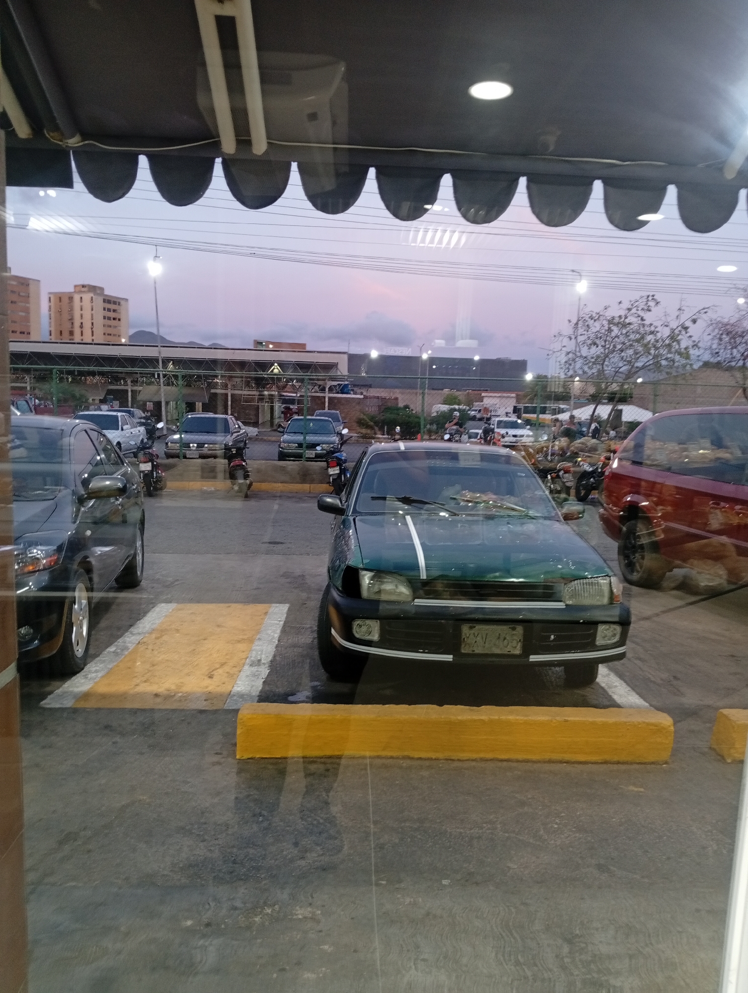 The photo, taken through a window, depicts a parking lot in Juan Griego, Venezuela