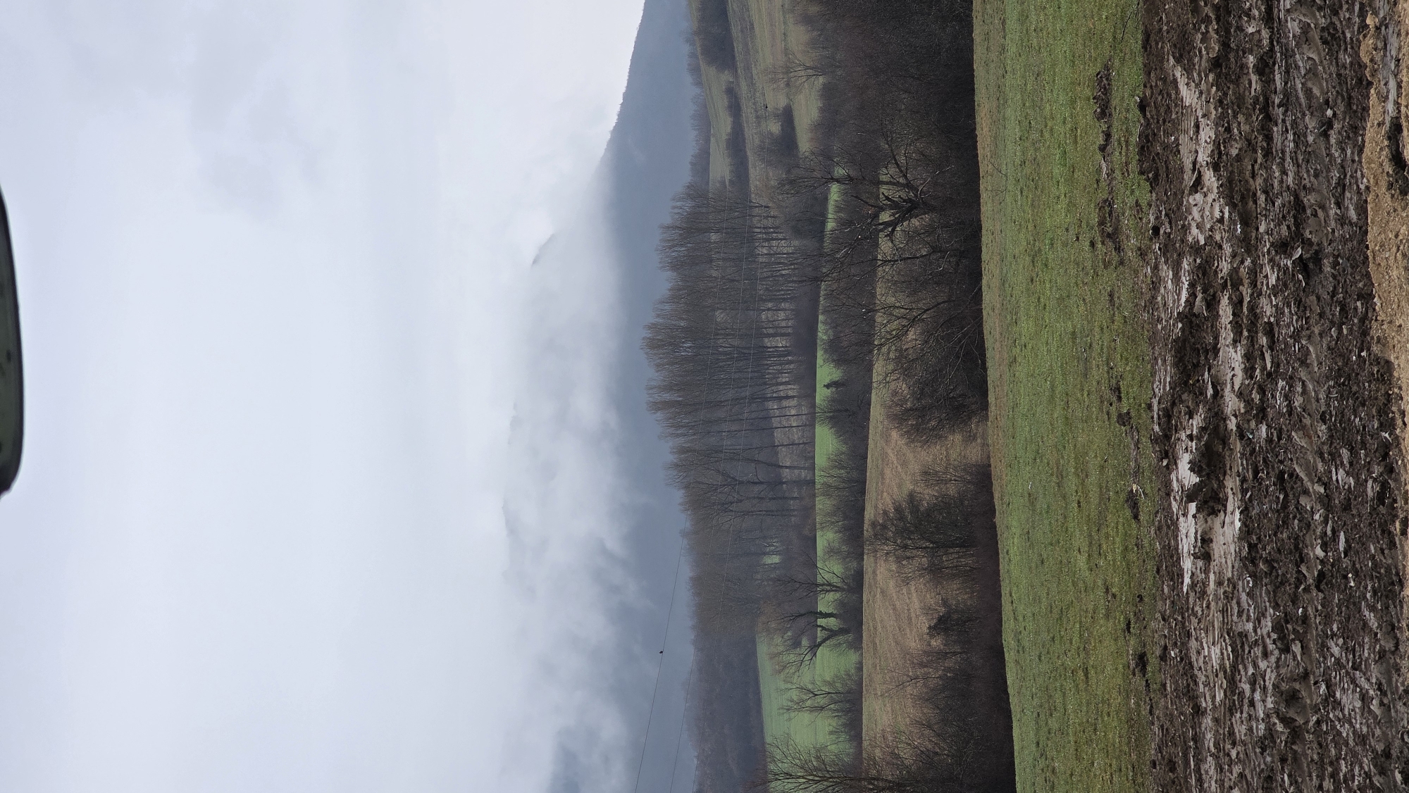 This vertical image depicts a rural landscape in Yablanitsa, Bulgaria, under an overcast sky. The immediate foreground consists of dark brown, heavily churned mud with visible tire tracks and standing water, transitioning into a patch of green grass. Beyond this, a series of rolling fields are visible, including sections of bright green vegetation and areas of lighter brown, possibly tilled soil. Numerous bare deciduous trees and shrubs are distributed across the midground, with a distinct, linear formation of tall, slender leafless trees forming a prominent vertical element. Multiple utility lines, likely power or telephone lines, traverse the midground horizontally, with a small dark bird perched on the uppermost line in the left portion of the frame. In the background, hills or mountains rise, their upper reaches obscured by dense, low-hanging grey clouds. The sky is uniformly light grey due to the heavy cloud cover. A dark, out-of-focus object partially encroaches from the top edge of the frame. No human subjects are present.