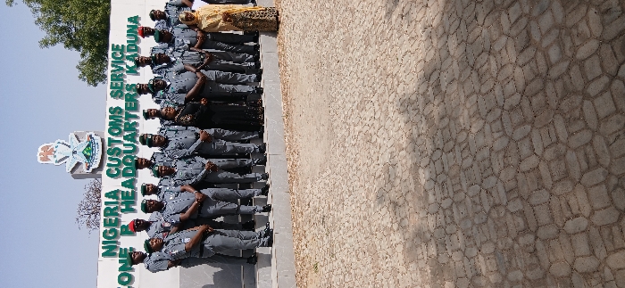 A group of approximately 18 individuals is depicted standing outdoors for a photograph in front of the Nigeria Customs Service Zone B Headquarters in Kaduna, Nigeria