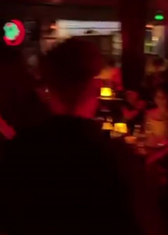 crowded bar with people seated at tables and standing, lit by dim, colored lights, mainly red and green. Tables are scattered throughout the space, some illuminated by small, lantern-like lamps. Several individuals can be seen interacting with each other, though the details of their conversations and interactions are unclear. The background is filled with blurred figures, adding to the atmosphere of a busy night out.