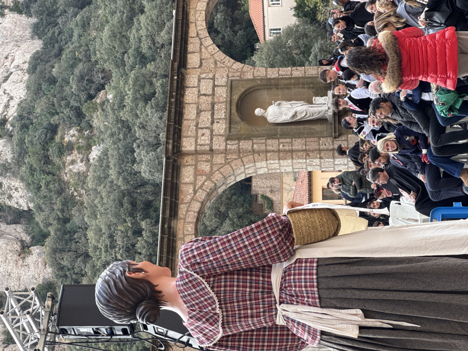 The image depicts an outdoor gathering in Monistrol de Montserrat, Spain, with a large "geganta" (giant figure) dominating the immediate foreground