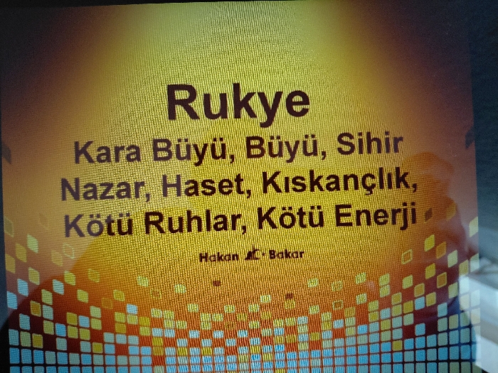 The scene depicts a close-up, slightly angled photograph of a digital screen, observed within an indoor environment in Dospat, Bulgaria. The screen exhibits Turkish text against a vibrant, horizontally-oriented gradient background that transitions from a bright golden-yellow on the right to a deeper orange-yellow on the left. The far-left portion of the background features a decorative pattern of small, scattered square and diamond-shaped pixels or tiles in shades of blue, orange, yellow, and white. The primary textual content, presented in dark lettering, begins with "RUKYE" prominently displayed. Below this, successive lines read "Kara Büyü, Büyü, Sihir", "Nazar, Haset, Kıskançlık", and "Kötü Ruhlar, Kötü Enerji". At the lower-left, smaller text indicates "Hakan Al-Bakar". The image quality reveals visible pixellation and a screen door effect, characteristic of a photograph taken of a digital display rather than a direct screenshot. Slight reflections are present on the screen's surface, consistent with ambient light interacting with a glossy display. No individuals, direct actions, or interactions are visible within the frame.