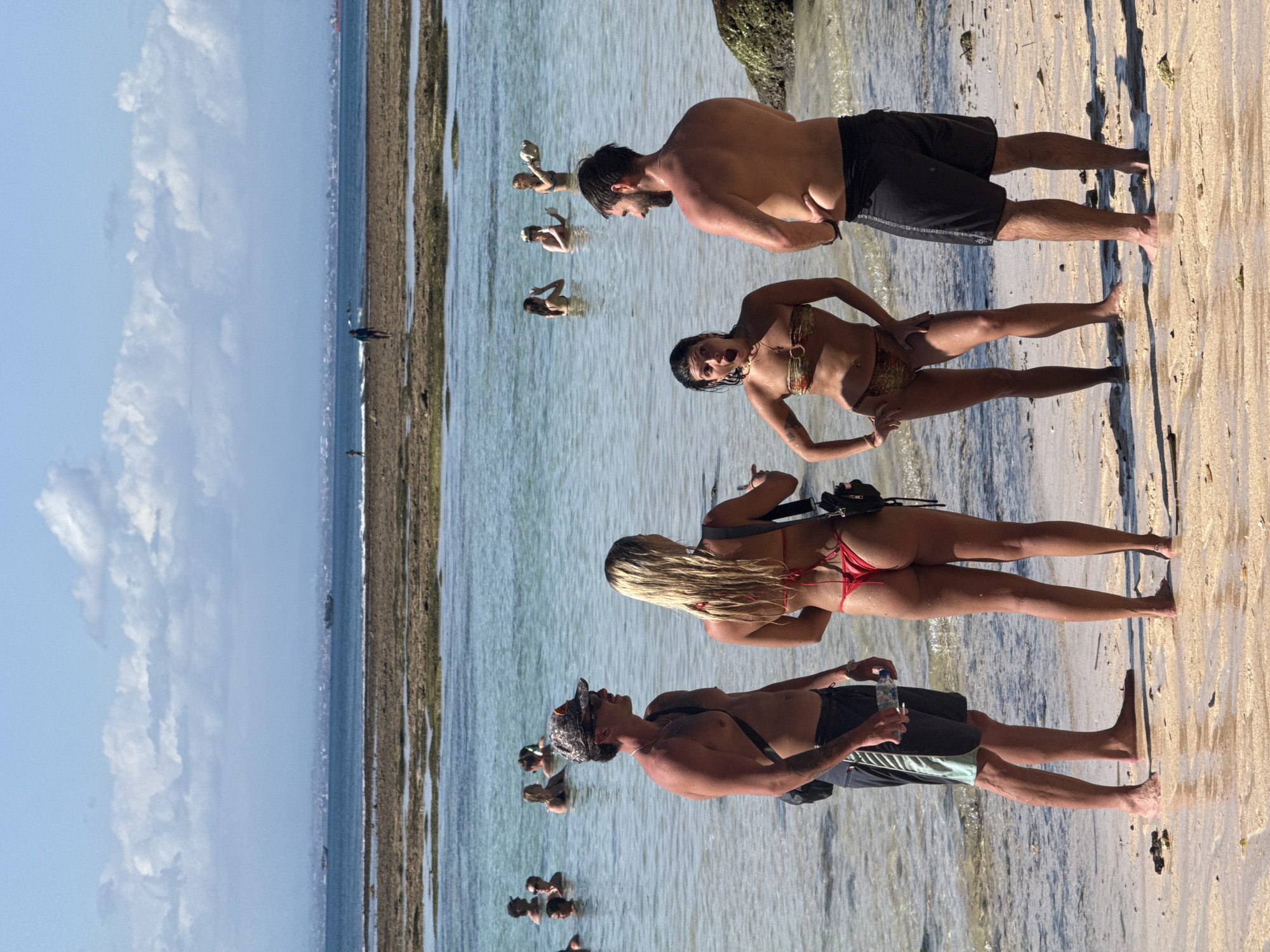 A group of people are gathered on a beach during daytime, with shallow water and a clear sky with some clouds visible. Four figures are prominent in the foreground. Two women are wearing bikinis; one is red and one is patterned, and they are standing near two men who are wearing shorts. Two of the figures are posing in the water with other people in the background in the ocean. Based on the environment and geography, this is likely on Pandawa Beach. Kuta Selatan, Indonesia.