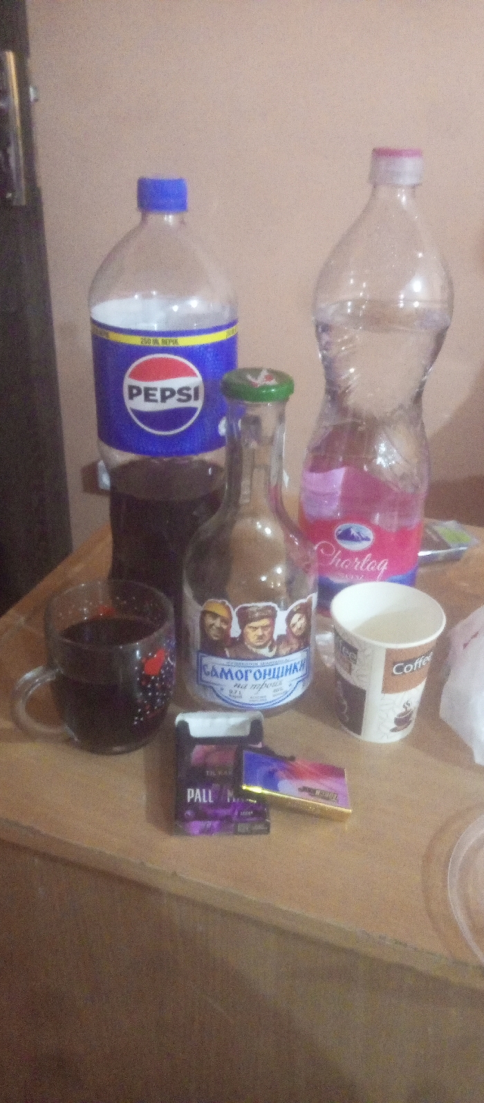 The scene displays a collection of consumed and unconsumed items on a light-brown wooden table surface, positioned against a plain light-colored wall. A dark vertical element is partially visible on the far left. Items include a partially consumed 2.5-liter Pepsi bottle with a blue screw cap, a 0.7-liter glass bottle of "САМОГОНЩИКИ" (Samogonshchiki) 40% alcohol with a green metal screw cap and a label depicting three male figures, and a partially consumed plastic bottle of "Chortoq" water with a pink screw cap. A clear glass mug containing a dark-colored liquid is present to the left foreground. An empty or near-empty disposable paper "Coffee" cup is situated to the right. A pack of purple "PALL M." (Pall Mall) cigarettes and a gold-colored lighter are placed on the table between the mug and the coffee cup. No individuals or active events are depicted. The location is Unknown, Unknown.