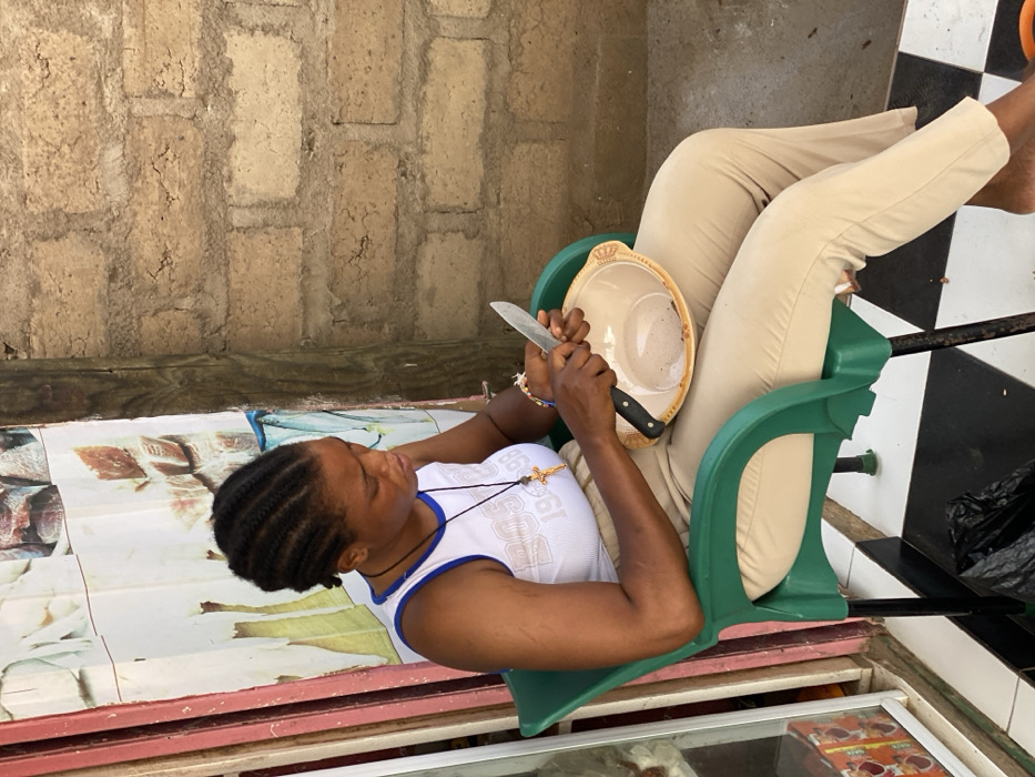 A woman sits in a green plastic chair with beige pants, legs raised. She holds a knife and a ceramic bowl in her hands. She wears a white tank top with black trim and has braided hair. A necklace with a cross is visible. Behind her is a weathered brick wall, and she's seated beside a horizontal surface with food images printed on it. Black and white checkered tiles are also visible at the right edge of the image.