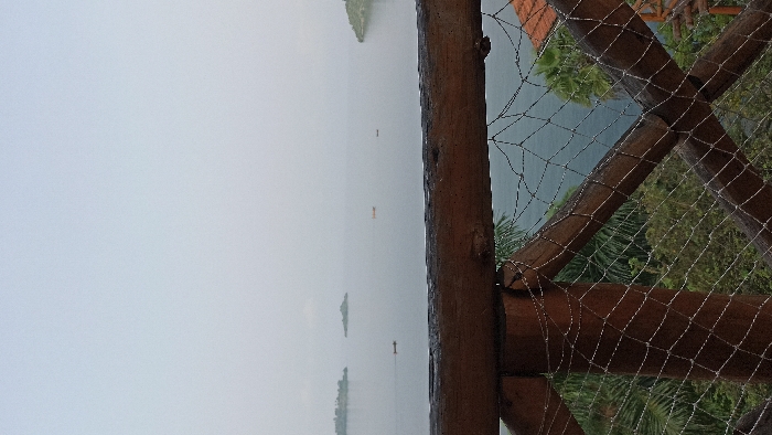A misty view of a body of water with scattered landmasses and what appear to be structures. A rustic wooden fence with a wire mesh overlay frames the scene. Green foliage is visible through the mesh, suggesting a tropical or lush environment. The fence is constructed with thick wooden posts and crossbeams, giving a sense of solidity and age. The fog obscures the horizon.