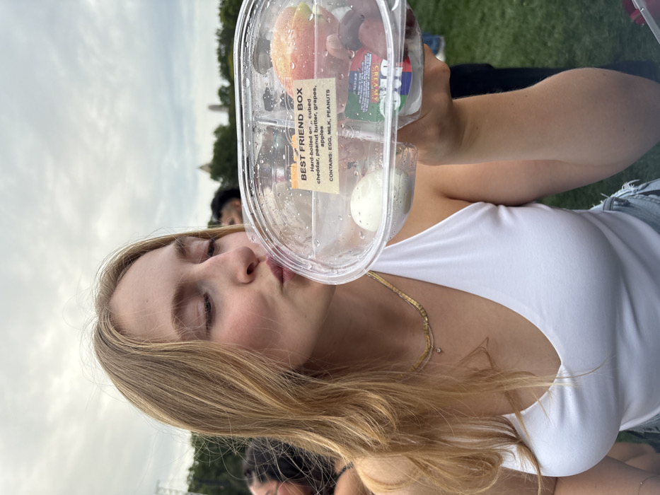 A young adult female with long, blonde hair and light skin, wearing a white halter-neck top and a layered gold necklace, is depicted outdoors in a medium shot. She holds a clear plastic container labeled "BEST FRIEND BOX" with her right hand and is positioned as if kissing the container's lid with pursed lips, her eyes closed. The container is divided into compartments, containing a hard-boiled egg, cubed cheddar, a small packet of peanut butter, grapes, and a red apple. The label also states "CONTAINS: EGG, MILK, PEANUTS". The background features a grassy area, suggesting a park, with blurred figures of other individuals and trees. A distinctive stone structure resembling a castle tower or spire is visible in the distant background, identifying the location as Central Park in New York City, United States, likely near Belvedere Castle. The sky is overcast.
