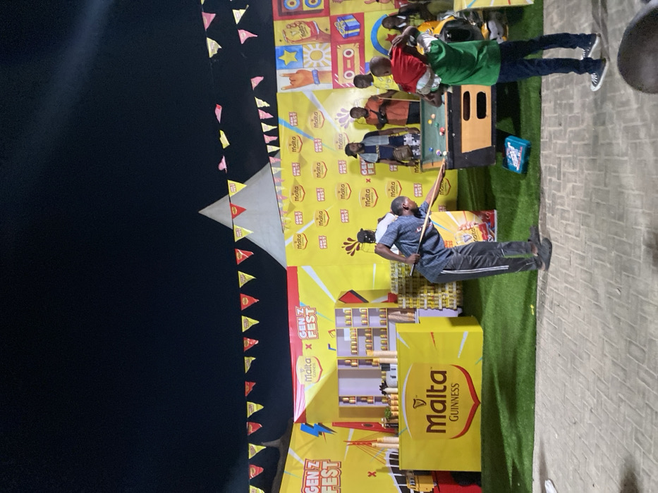 At a Malta Gen Z Fest event, a man is playing pool while other people watch. The event is decorated with yellow and red flags and features Malta Guinness branding. The booth is vibrant with graphics and the pool table is set up on artificial grass. The background is dark, suggesting the event is taking place in the evening.