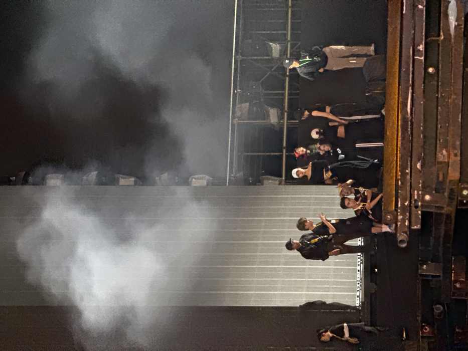 The image depicts a backstage or side-stage area of an outdoor event or concert venue in Nha Trang, Vietnam. The scene is dark, illuminated by artificial lighting, with significant amounts of white and gray stage smoke or fog filling the upper and central portions of the frame. A large, ribbed, light-colored vertical structure, possibly an LED screen or backdrop, dominates the left side of the image. Above and to the right, black metal scaffolding and truss structures are visible, indicative of stage rigging. The foreground consists of stacked dark platforms or stage risers, creating a multi-level surface. Approximately 15 individuals are present on or near these platforms. On the far left, a person in dark clothing is partially obscured by the large vertical structure, next to another individual in a black top. Further to the right, a male in a black cap and dark jacket stands, observing the scene, next to a younger male in a dark t-shirt who is actively looking at a mobile phone. In the central right, a group of about seven individuals stands or sits. This group includes several females in dark, casual attire, such as cropped tops, wide pants, and baseball caps. One female is wearing a yellow fanny pack. A male is seated on the platform among this group. On the far right, another male, wearing a light-colored shirt, light pants, and a dark cap, stands near two dark bags or pieces of equipment resting on the platform. The individuals appear to be a mix of performers, crew, or staff, predominantly standing and observing their surroundings or engaging in minor interactions. The overall impression is one of waiting or preparation during a performance event.