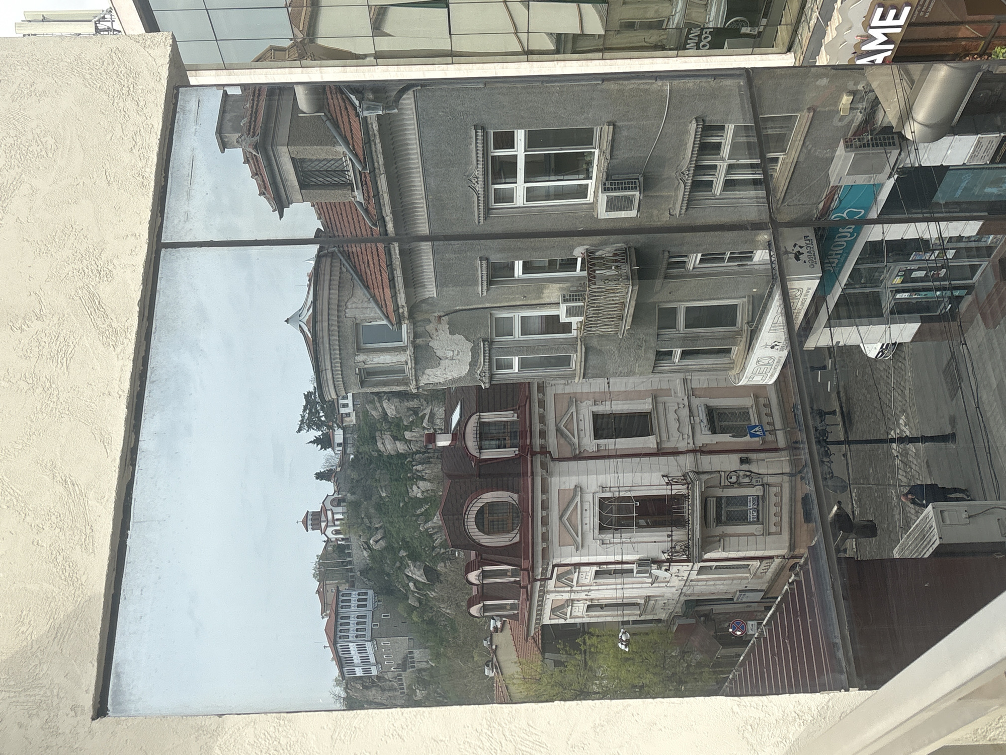 The image captures a reflection in a window, showcasing a layered urban scene. In the foreground, elements of the building where the photo is taken are visible, framing the reflected view. The reflection primarily displays a cityscape, likely in Plovdiv, Bulgaria, characterized by varied architectural styles. Buildings of different heights and designs are present, some with distinct red-tiled roofs and others with more modern facades. The reflection also reveals street-level details, including signage, street furniture, and possibly pedestrians. Notably, a person is seen bending down to the right. The reflection creates a composite image, blending the immediate surroundings of the window with the broader urban landscape.